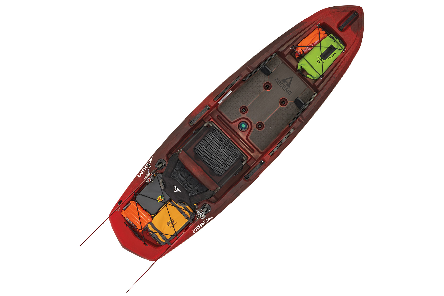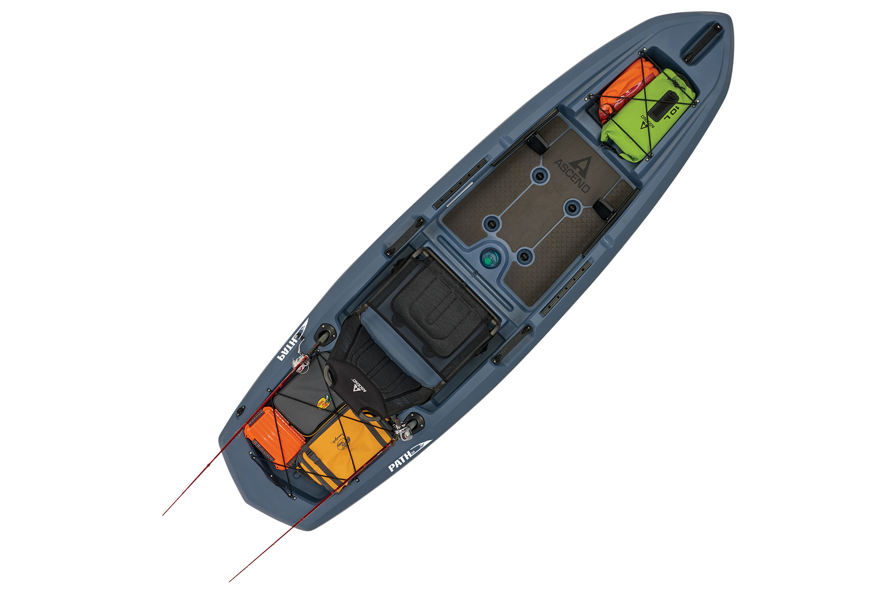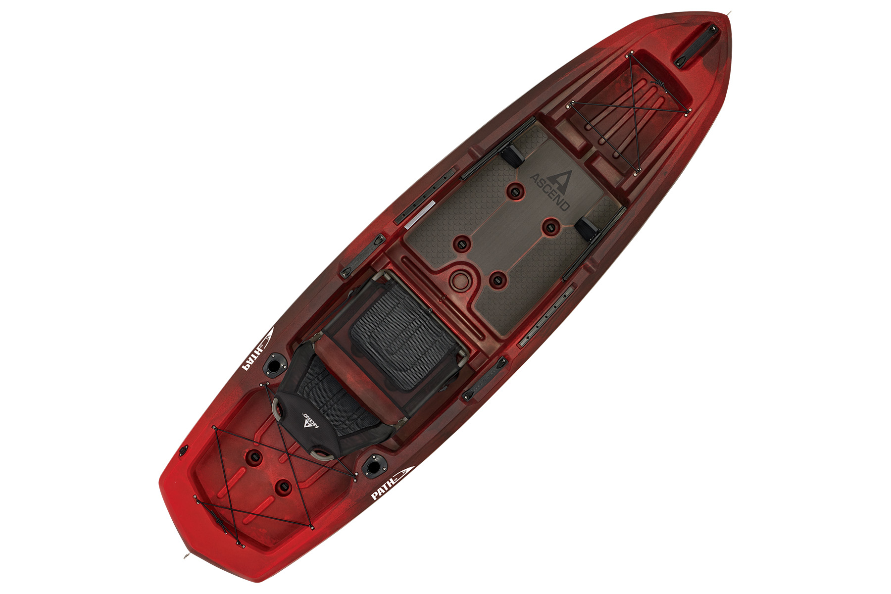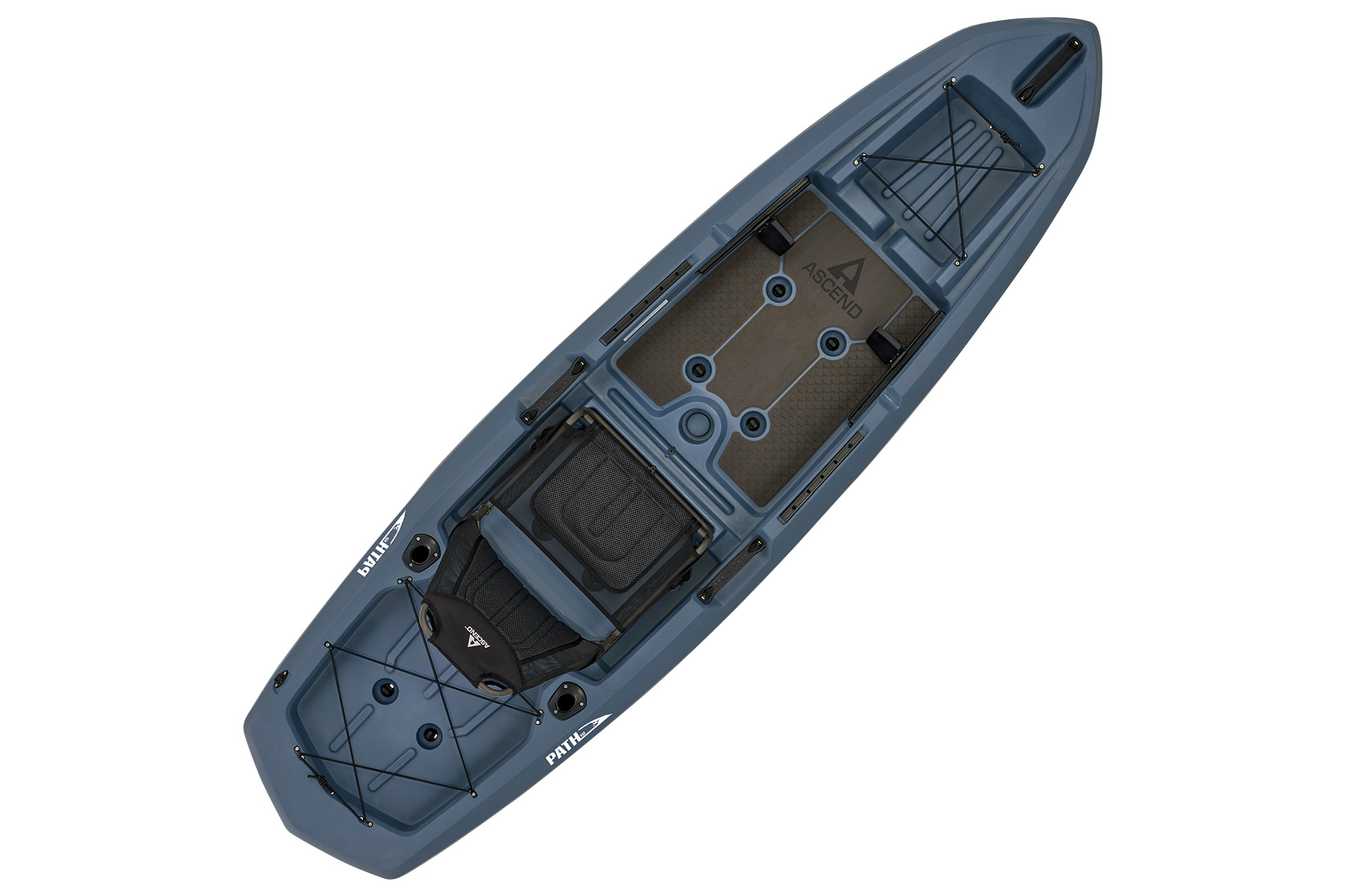The Path 10 sports a custom hybrid catamaran/tunnel hull for outstanding stability, while the optimized open-deck design provides great leg room and unique storage solutions. Experience the ultimate in comfort with a modified version of our popular deluxe seat. This high-back, removable, suspended seating system utilizes ballistic nylon monofilament mesh and 3D soft polyester mesh for moisture drainage and breathability. On-deck, the Path 10 has port and starboard rod staging areas, along with storage areas port, starboard, and under the seat. Custom, non-skid, cushioned deck flooring makes standing and fishing refreshingly easy. The Ascend Path 10 adds a weathertight storage deck plate, dual flush-mount rod holders, adjustable foot braces, 8 scupper drains with plugs, an enhanced bow design, two 12" accessory rail mounts with landings mid-ship port and starboard to accommodate almost all aftermarket kayak fishing accessories, completing the Path 10 as the best choice for adventurers or anglers seeking performance and stability.