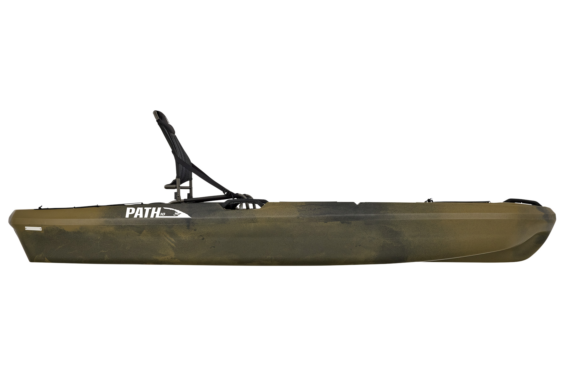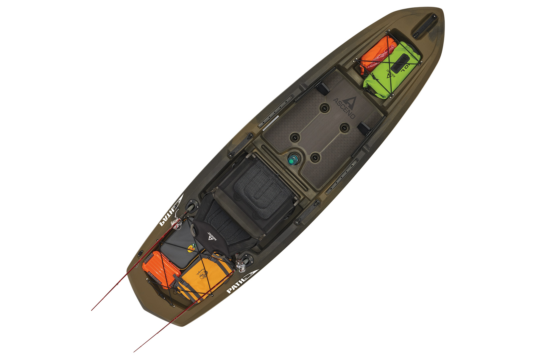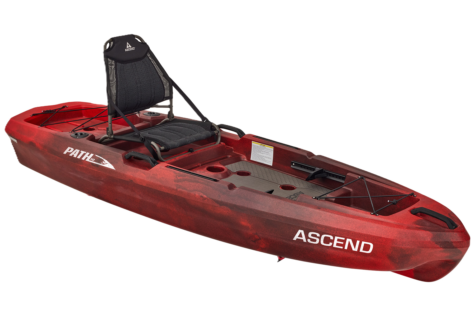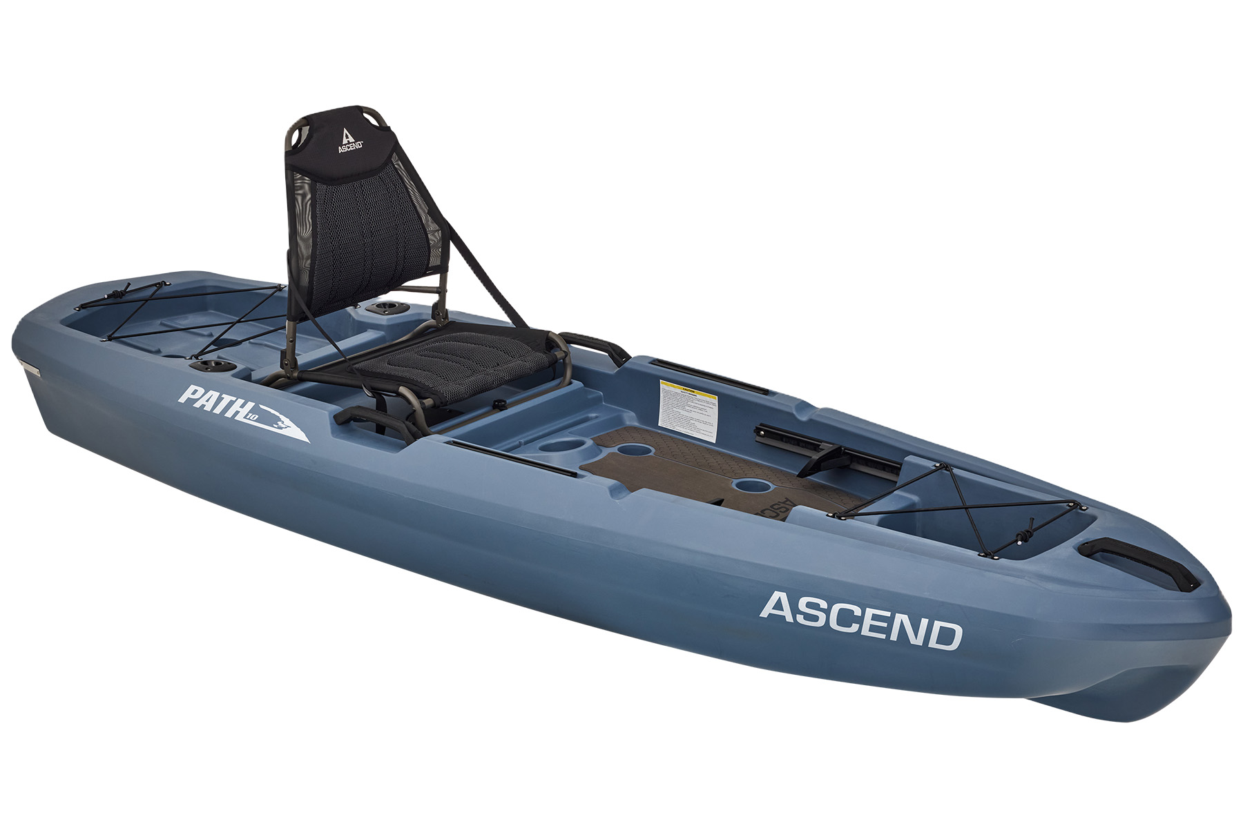 The Path 10 sports a custom hybrid catamaran/tunnel hull for outstanding stability, while the optimized open-deck design provides great leg room and unique storage solutions. Experience the ultimate in comfort with a modified version of our popular deluxe seat. This high-back, removable, suspended seating system utilizes ballistic nylon monofilament mesh and 3D soft polyester mesh for moisture drainage and breathability. On-deck, the Path 10 has port and starboard rod staging areas, along with storage areas port, starboard, and under the seat. Custom, non-skid, cushioned deck flooring makes standing and fishing refreshingly easy. The Ascend Path 10 adds a weathertight storage deck plate, dual flush-mount rod holders, adjustable foot braces, 8 scupper drains with plugs, an enhanced bow design, two 12" accessory rail mounts with landings mid-ship port and starboard to accommodate almost all aftermarket kayak fishing accessories, completing the Path 10 as the best choice for adventurers or anglers seeking performance and stability.